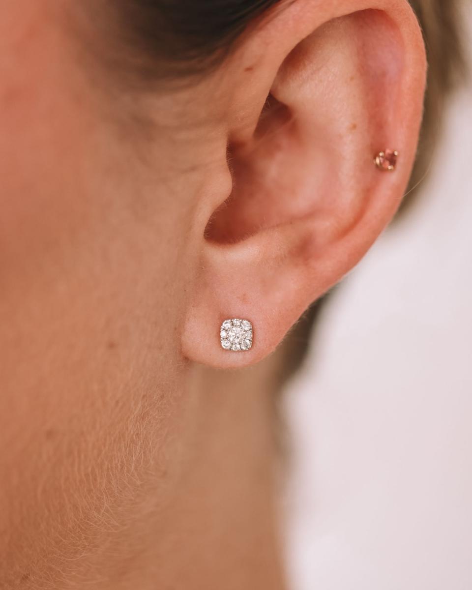 A refined pair of cushion shaped earrings crafted in 18ct white gold, each earring featuring a cluster of round cut diamonds.