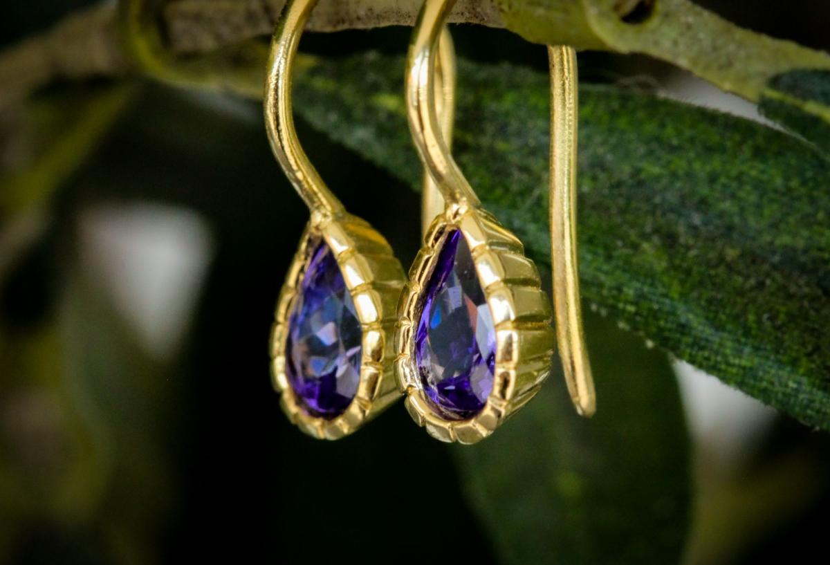 Discover the allure of these stunning 18ct yellow gold drop earrings, featuring two mesmerising pear cut tanzanites totaling 1.20ct. The vibrant violet-blue hues of the tanzanites are beautifully complemented by the warmth of the yellow gold setting, creating a timeless elegance.