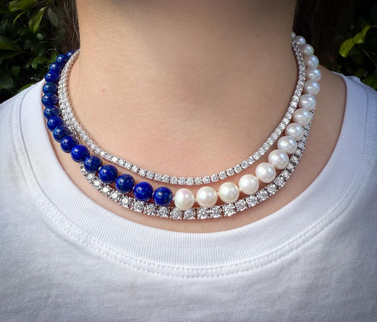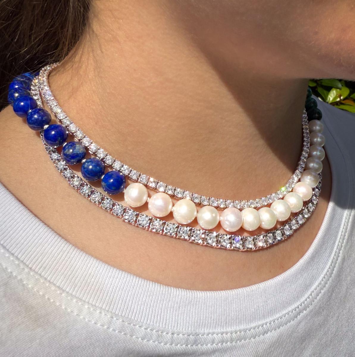 A CLASSIC PIECE, MADE FOR EVERY WARDROBE AND FOR EVERYDAY WEAR. 129 ROUND BRILLIANT CUT DIAMONDS ARE SET IN AN 18CT WHITE GOLD TENNIS NECKLACE. NECKLACE FEATURES A BOX CLASP AND TWO FIGURE EIGHT CLIP FOR SECURE WEARING.