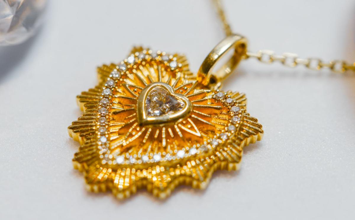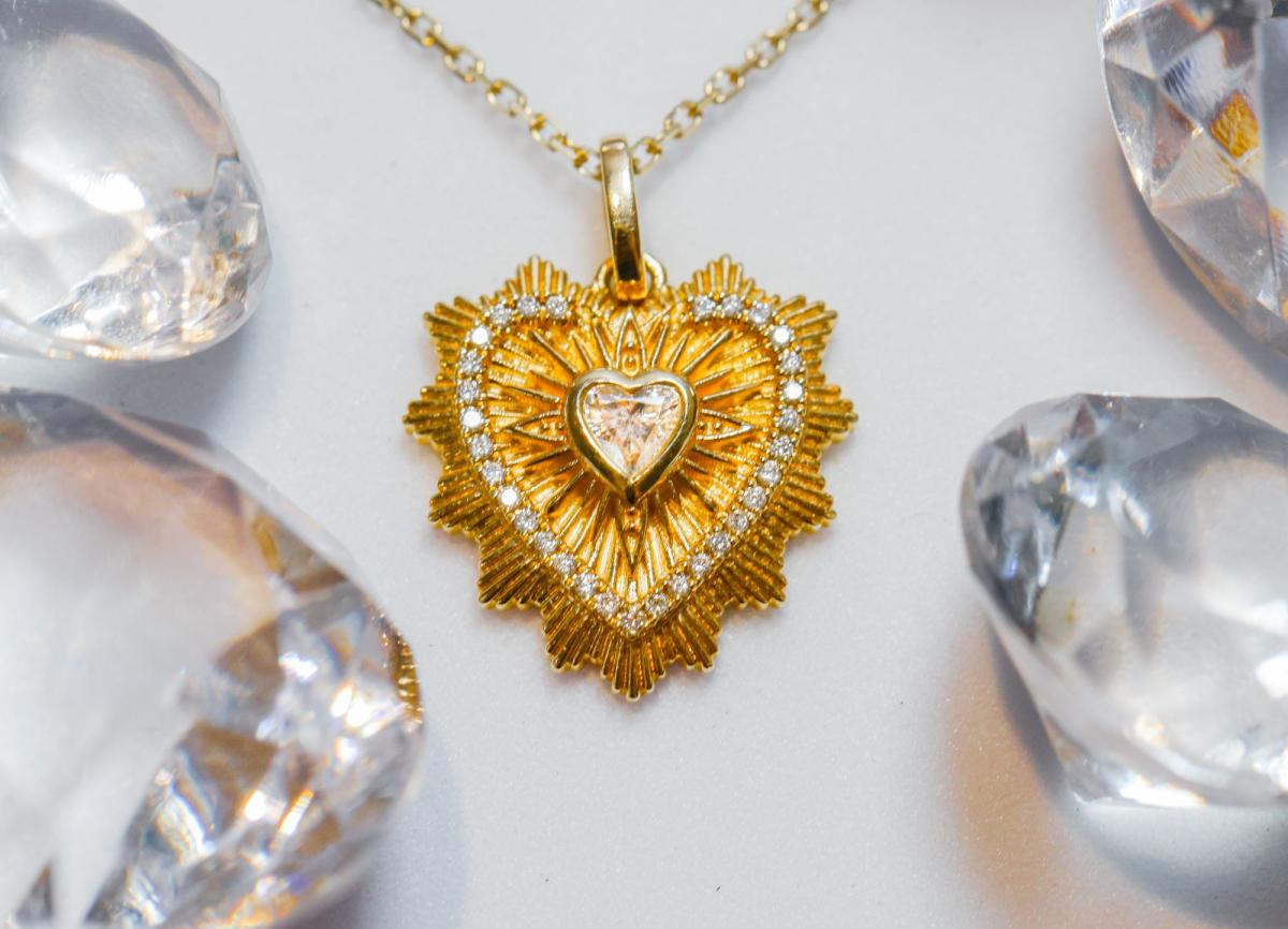 THIS PENDANT FEATURES A HEART-SHAPED DIAMOND, BEZEL SET IN THE CENTRE AND FRAMED BY 31 ROUND BRILLIANT CUT DIAMONDS, ALL SET IN 18CT YELLOW GOLD WITH UNIQUE LINED DETAILING. THE PENDANT ALSO COMES PERFECTLY COUPLED WITH A 46CM, ADJUSTABLE 18CT YELLOW GOLD TRACE CHAIN.