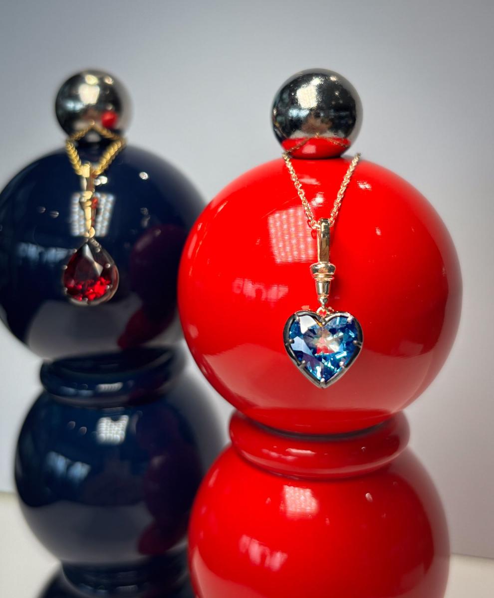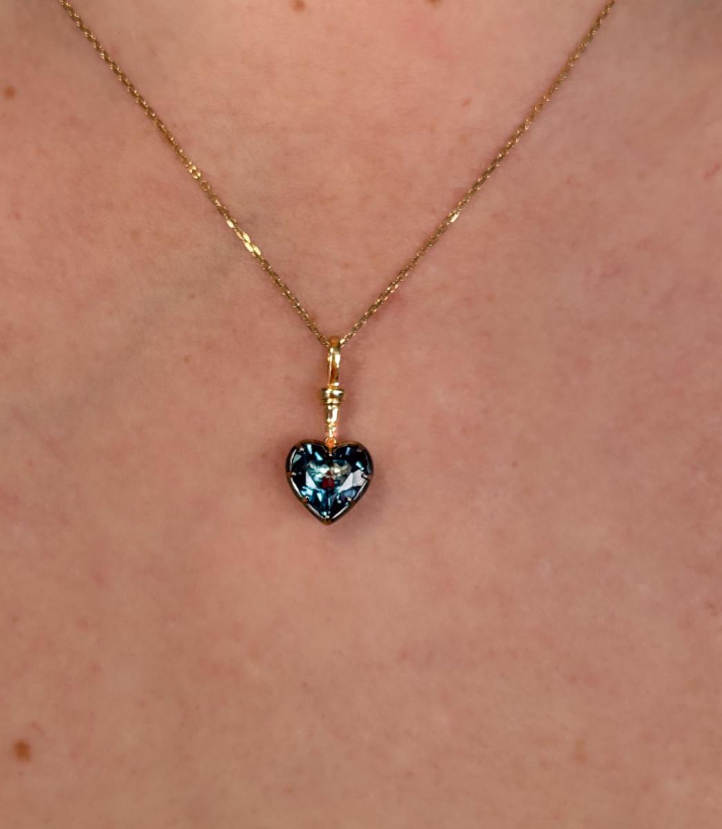 THIS HEART-SHAPED PENDANT FEATURES ONE LONDON BLUE TOPAZ WEIGHING 2.86CT, CLAW SET IN 18CT YELLOW GOLD WITH BLACK RHODIUM TO ENHANCE THE BLUE HUE OF THE TOPAZ.