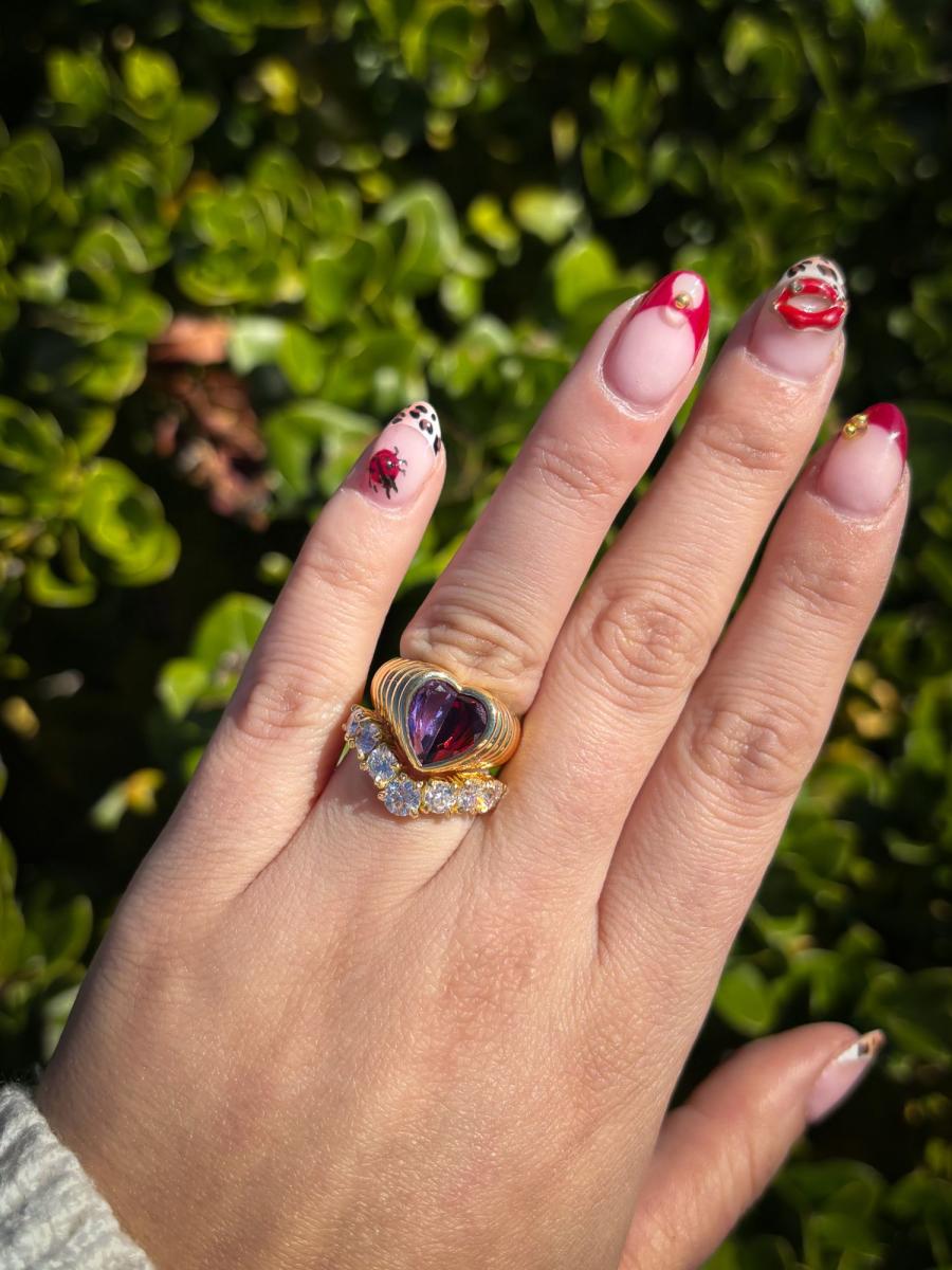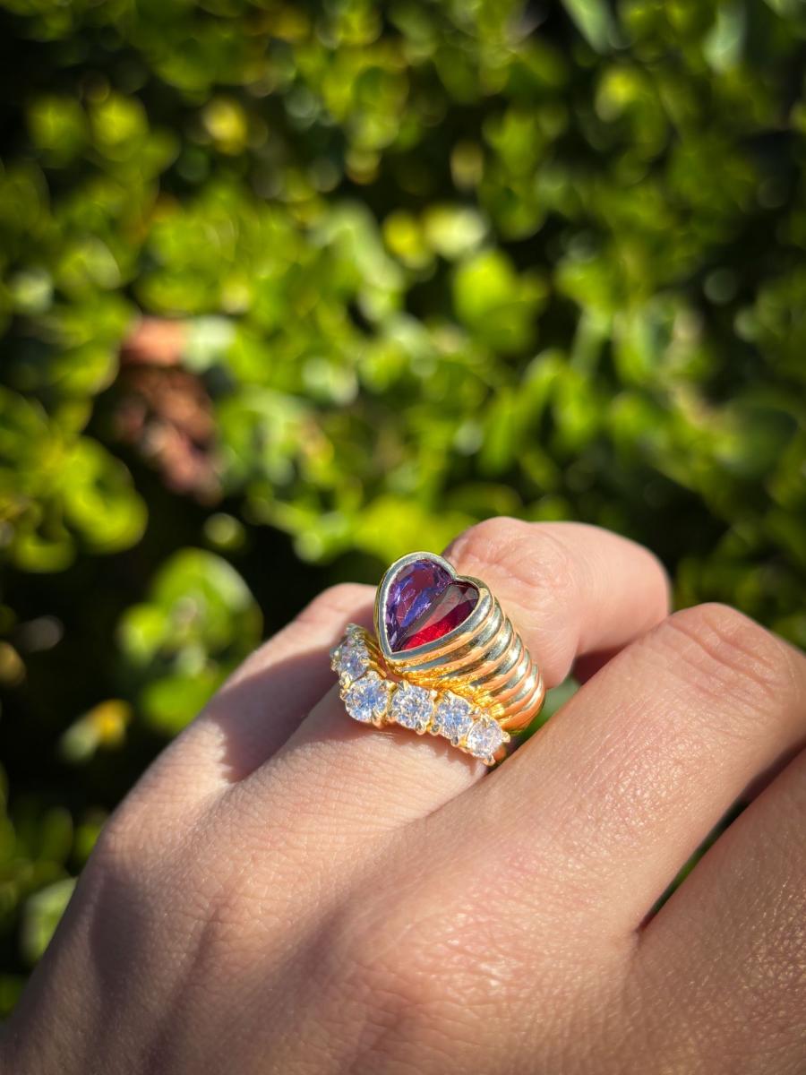 THIS STUNNING 18CT YELLOW GOLD RING FEATURES A 1.15CT AMETHYST AND A 1.80CT GARNET, EXPERTLY CUT INTO A MESMERISING HEART SHAPE. THE PERFECT MARRIAGE OF PURPLE AND RED HUES SYMBOLIZES PASSION AND POWER, MAKING THIS ONE-OF-A-KIND PIECE A STATEMENT OF INDIVIDUALITY.