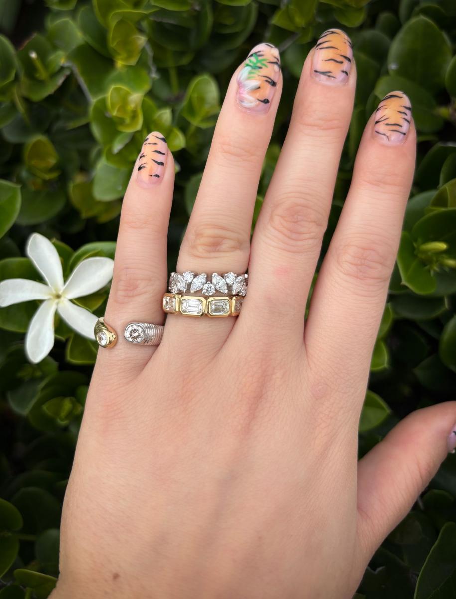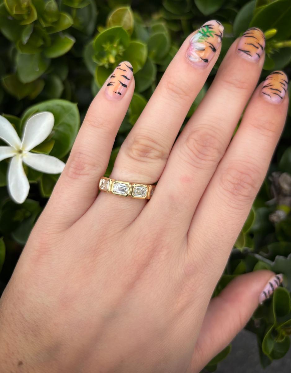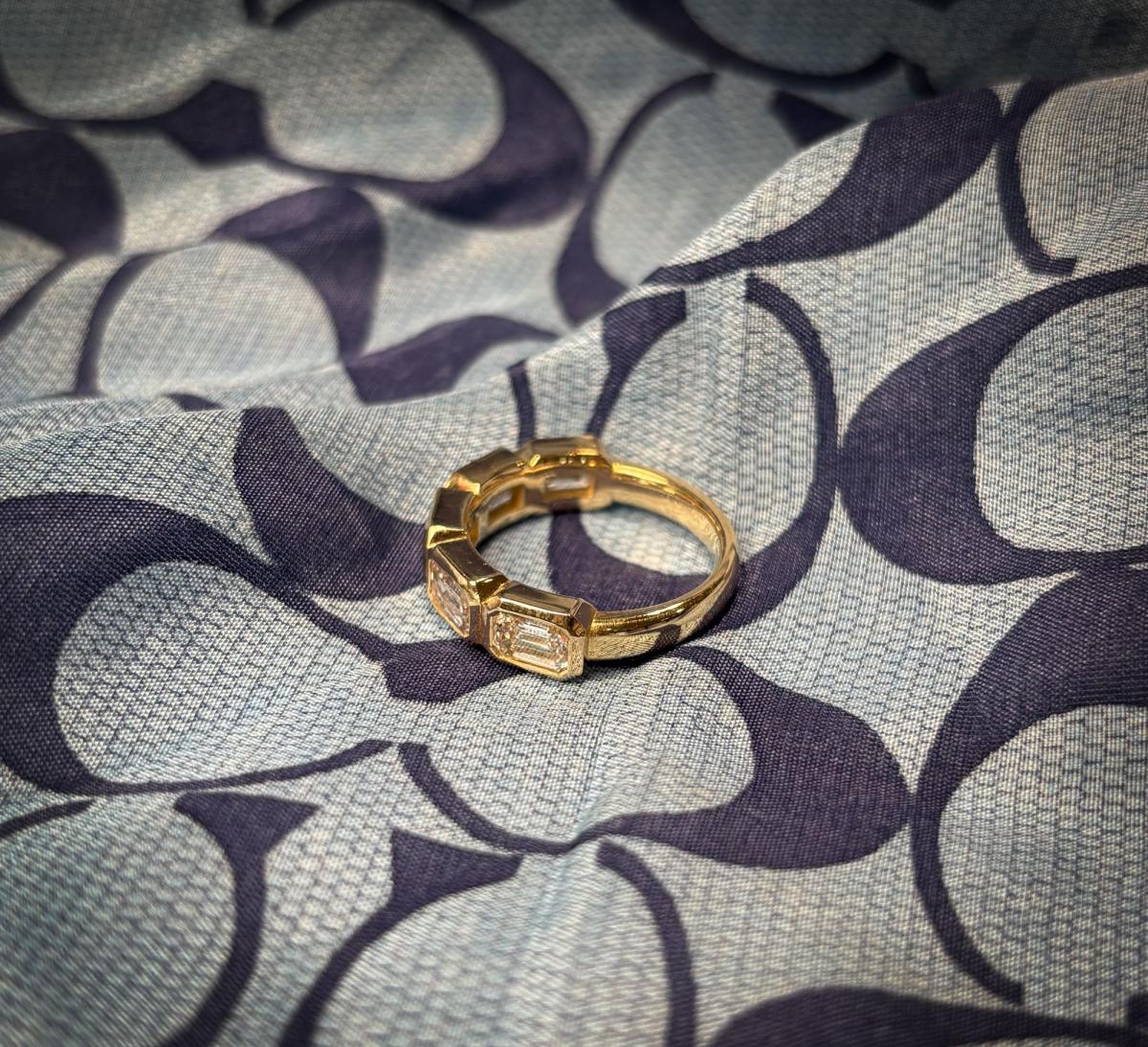 THIS SOLID 18CT YELLOW GOLD RING FEATURES FIVE G.I.A CERTIFIED F COLOUR, SI CLARITY, EMERALD CUT NATURAL DIAMONDS WEIGHING A TOTAL OF 2.52CT. EACH DIAMOND HAS BEEN INDIVIDUALLY HAND-SET IN A BEZEL SETTING ALONG THE TOP HALF OF THE RING, WITH A BAND WIDTH OF 2.9MM. THIS RING IS AN ABSOLUTE STATEMENT PIECE, WHETHER WORN SOLO OR AS AN ETERNITY RING OR WEDDING BAND.