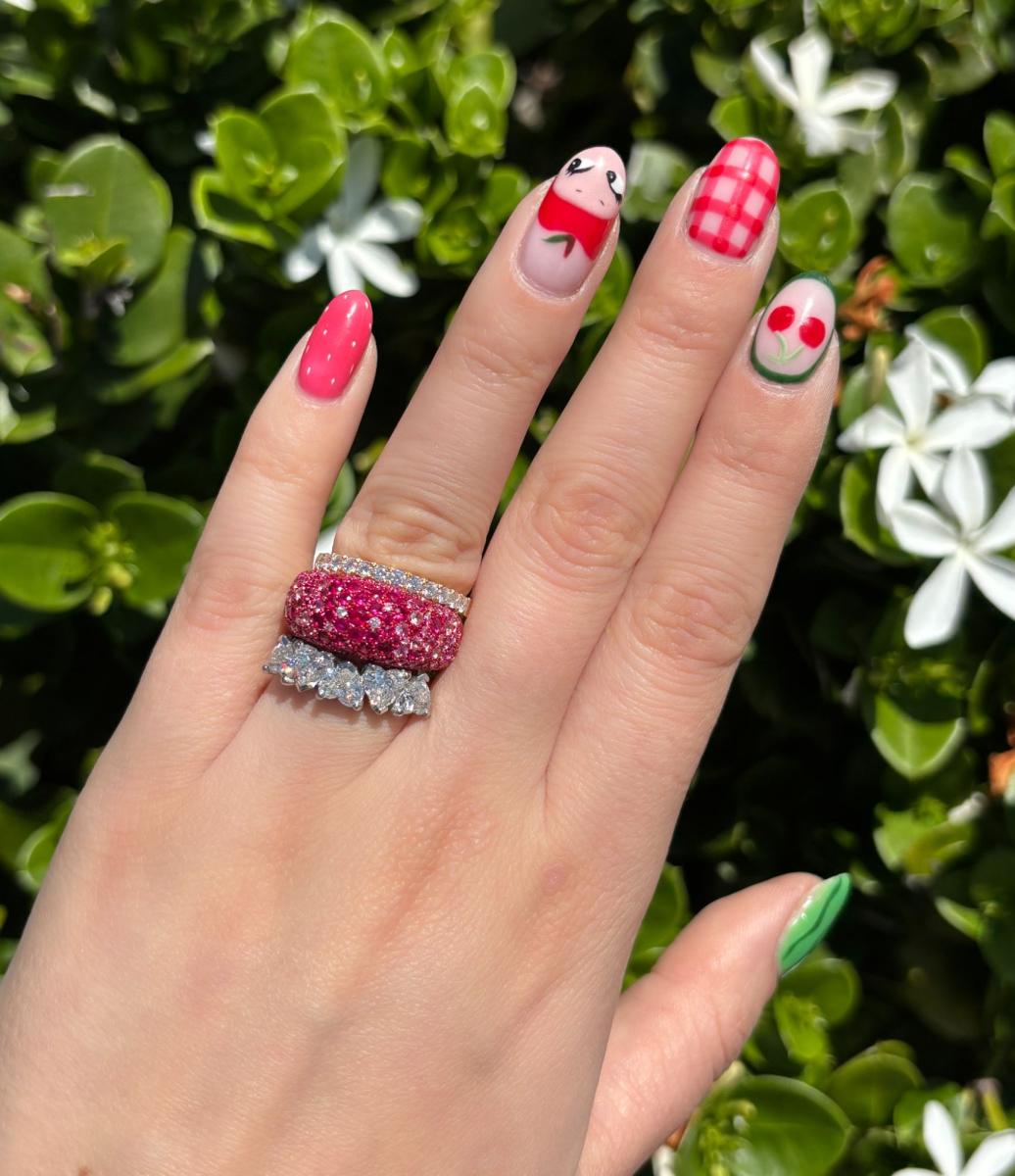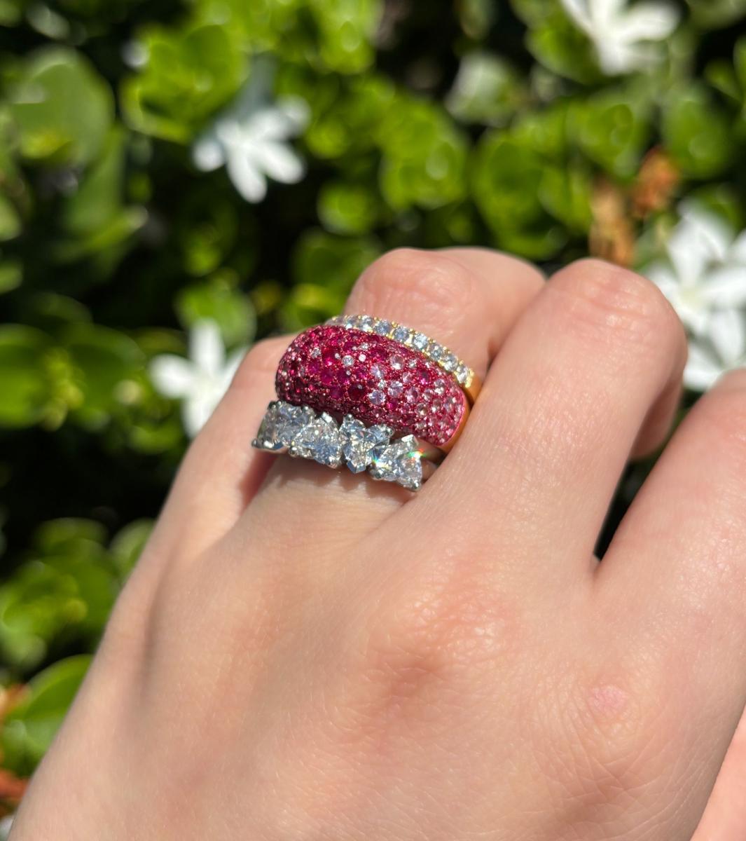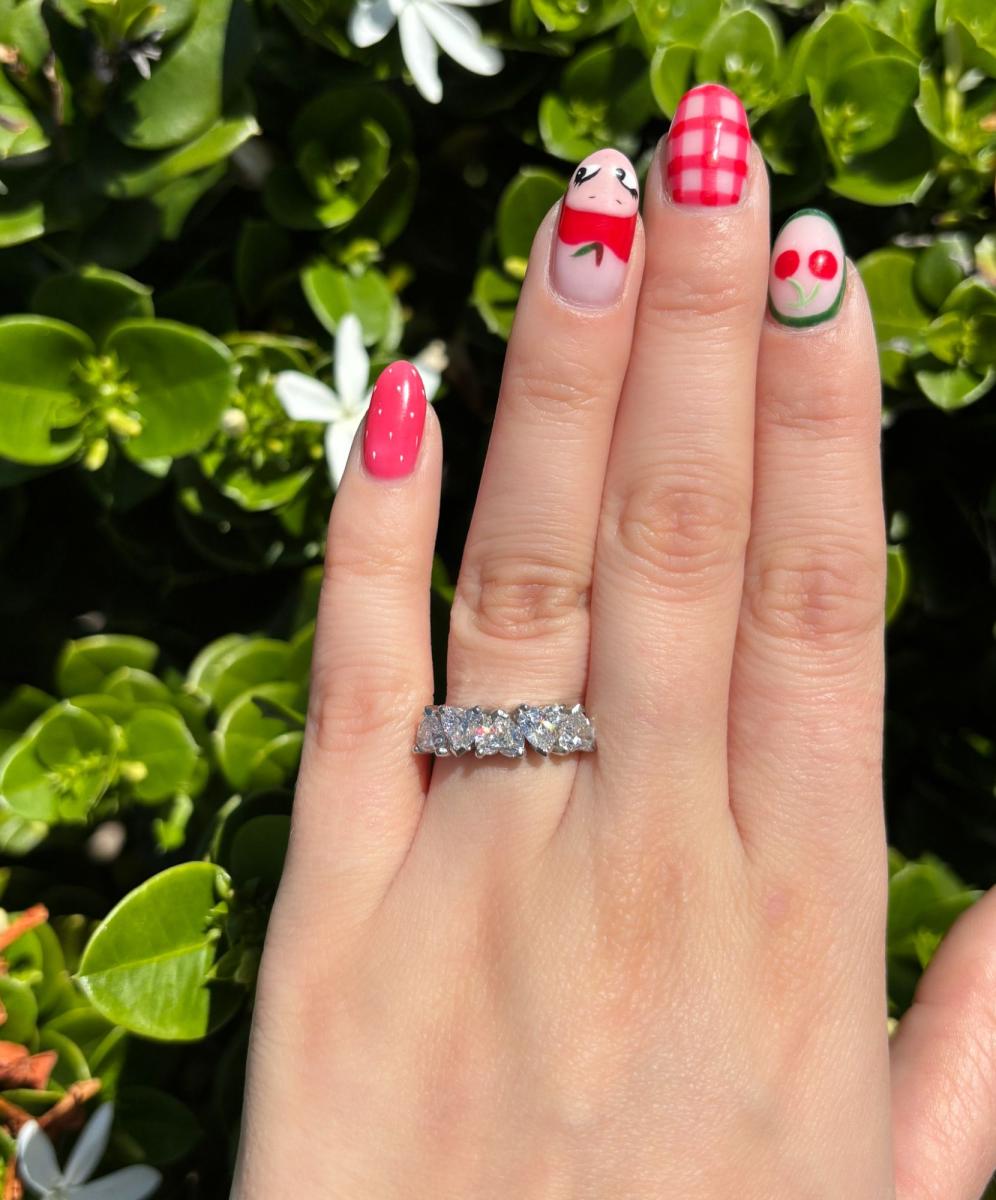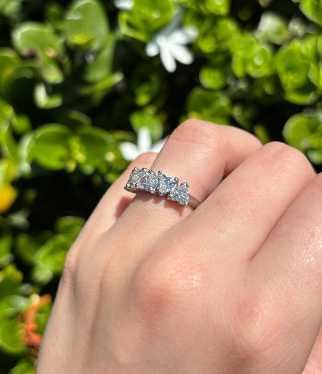 Crafted in high quality, luxurious Platinum and featuring a total of 2.50ct in heart shaped natural white diamonds, this ring is sure to turn heads with every sparkle. The diamonds are all G.I.A Certified E-F colour and SI2 clarity, and have been hand claw set in an alternating style along the top half of the ring.